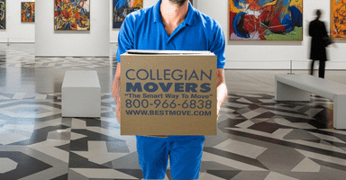 Collegian Movers professional mover delivering a box in an art gallery